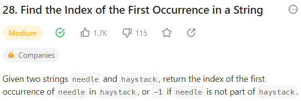 https://leetcode.com/problems/find-the-index-of-the-first-occurrence-in-a-string/description/