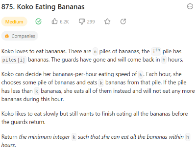 n개의 바나나 무더기가 존재하고 piles[i]의 의미는 i번째 무더기에 존재하는 바나나의 개수를 의미한다. 이를 지키는 가드가 h시간 후에 올 예정이며 이에 Koko는 시간당 k의 속도로 매 시간마다 하나의 무더기를 골라 바나나를 먹을 예정이다. 만약 선택한 무더기에 있는 바나나의 수가 k보다 적은 경우 해당 무더기에 남아있는 바나나만 먹게 된다.
