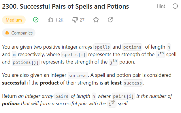 문제의 내용은 정수가 담긴 2개의 배열이 주어지고 이 배열들 간의 이루어질 수 있는 원소들간의 곱이 success라고 하는 기준점 이상인 경우를 count해서 spells 기준으로 가능한 경우의 수를 리턴하는 문제이다.