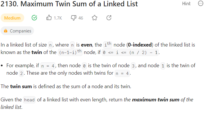 오늘의 문제는 LinkedList가 주어졌을 때 i번째 노드와 n-1-i번째 노드를 twin이라고 했을 때 여러 twin들이 등장할 텐데 이 twin내의 노드값의 합이 최대가 되는 값을 리턴하는 문제이다.