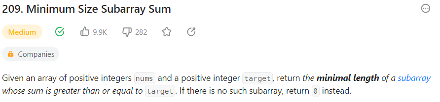 주어진 array에 대해서 target이 주어졌을 때 해당 target과 같거나 큰 합을 가지는 subarray의 최소 길이를 찾는 문제이다.