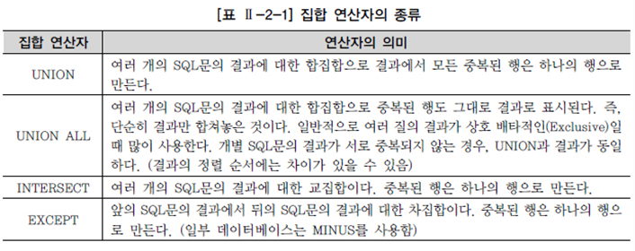 > 대다수의 벤더는 EXCEPT, 오라클은 MINUS 용어 사용