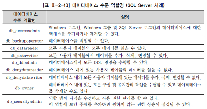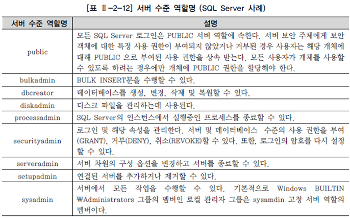 - 인스턴스 수준을 요구하는 로그인엥는 서버 수준 역할, 데이터베이스 수준을 요구하는 사이용자에게는 데이터베이스 수준 역할 부여