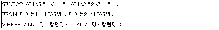 - JOIN에 사용된 칼럼들은 같은 데이터 유형이어야 하머 ALIAS나 테이블 명과 같은 접두가 불가