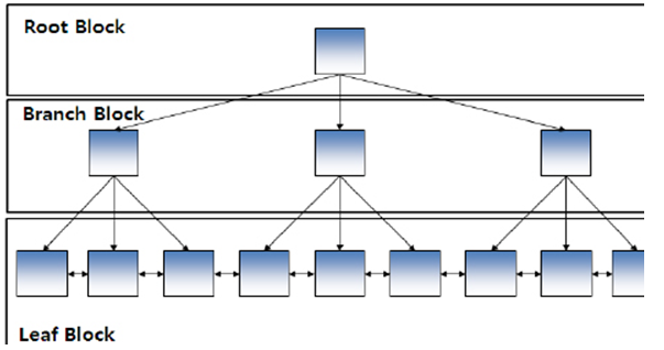 - 2) 리프 페이지의 모든 로우는 인덱스 키 칼럼 순으로 물리적으로 정렬
