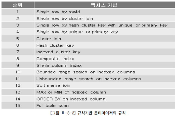 - 규칙기반 옵티마이저가 사용하지 않는 테이블, 인덱스, 칼럼 등의 다양한 객체 통계정보와 시스템 통계정보 활용