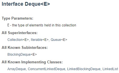 Deque 자체는 인터페이스이기 때문에 이를 구현한 ArrayDeque, LinkedList, LinkedBlockingDeque와 같은 클래스를 사용해야 한다.