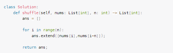 Shuffle the Array - Given the array nums consisting of 2n elements in the form [x1,x2,...,xn,y1,y2,...,yn]. Return the array in the form [x1,y1,x2,y2,...,xn,yn]. Example 1: Input: nums = [2,5,1,3,4,7], n = 3 Output: [2,3,5,4,1,7] Explanation: Since x1=2