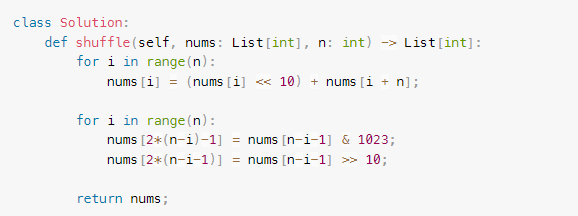 nums[2*(n-i-1)] = nums[n-i-1] >> 10;