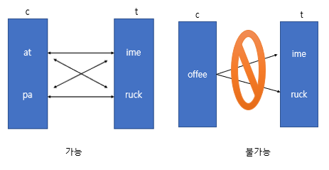 ex) "coffee"와 "toffee"의 경우 앞단어를 서로 바꾸면 결국엔 같은 단어로 안된다.