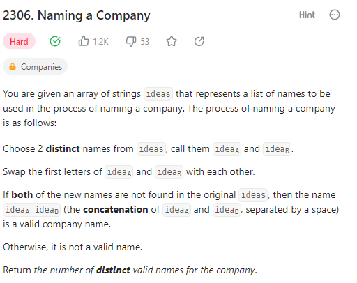 Naming a Company - You are given an array of strings ideas that represents a list of names to be used in the process of naming a company. The process of naming a company is as follows: 1. Choose 2 distinct names from ideas, call them ideaA and ideaB. 2. Sw
