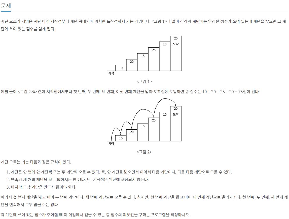 계단 오르기 게임은 계단 아래 시작점부터 계단 꼭대기에 위치한 도착점까지 가는 게임이다. <그림 1>과 같이 각각의 계단에는 일정한 점수가 쓰여 있는데 계단을 밟으면 그 계단에 쓰여 있는 점