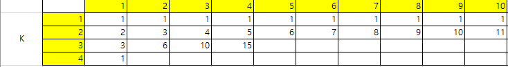→ 한번 N과 K를 차례대로 조정해보면서 직접 경우의 수를 구해보자.