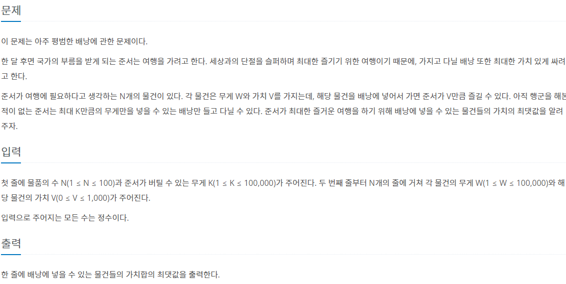 첫 줄에 물품의 수 N(1 ≤ N ≤ 100)과 준서가 버틸 수 있는 무게 K(1 ≤ K ≤ 100,000)가 주어진다. 두 번째 줄부터 N개의 줄에 거쳐 각 물건의 무게 W(1 ≤ W ≤ 100,000)와 해당 물건의 가치 V(0 ≤ V ≤ 1,000)