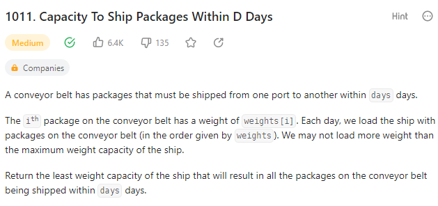 weights라고 하는 배열에 순서대로 옮겨야 할 물건의 무게가 들어있고 days라는 변수에는 옮기는데 주어진 시간이 들어있다. weights에 들어있는 물건 순서대로 물건을 배로 옮기는데 하루에 배로 옮길 수 있는 최대 무게가 최소화되도록 옮긴다고 했을 때 배의 capacity를 구하는 문제이다.