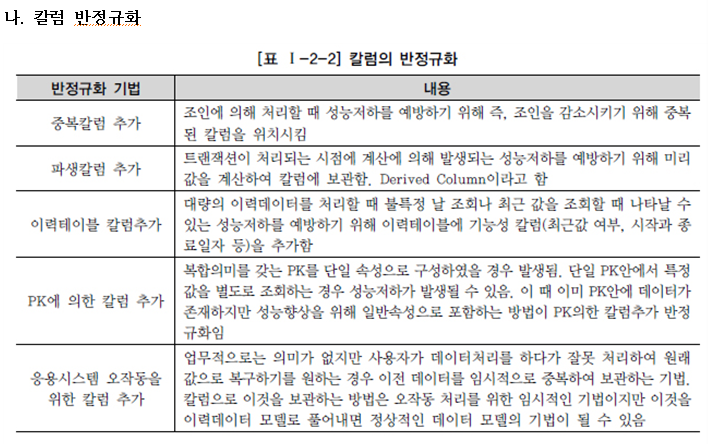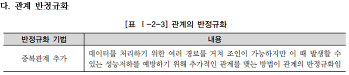 테이블과 칼럼의 반정규화는 데이터 무결성에 영향을 주나 관계의 반정규화는 데이터 무결성을 깨뜨릴 위험을 갖지 않고서도 데이터처리의 성능을 향상시킬 수 있음