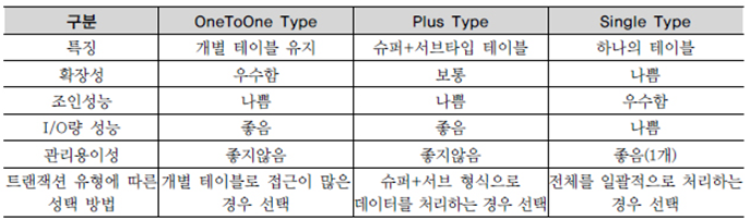2) 트랜잭션은 항상 서브타입 개별로 처리하는데 테이블이 하나로 통합되어 있어 많은 양의 데이터가 집약에 의한 저하