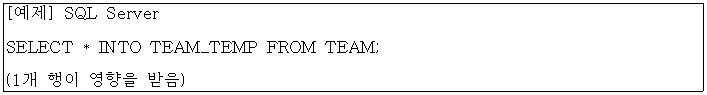 - SQL Server에서는 SELECT ~ INTO를 활용( IDENTITY를 칼럼 속성으로 사용하면 IDENTITY 속성까지 적용)