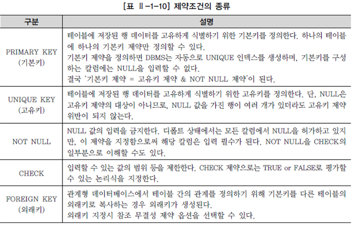 - 데이터의 무결성을 유지하기 위한 데이터베이스의 보편적인 방법으로 테이블의 특정 칼럼에 설정하는 제약