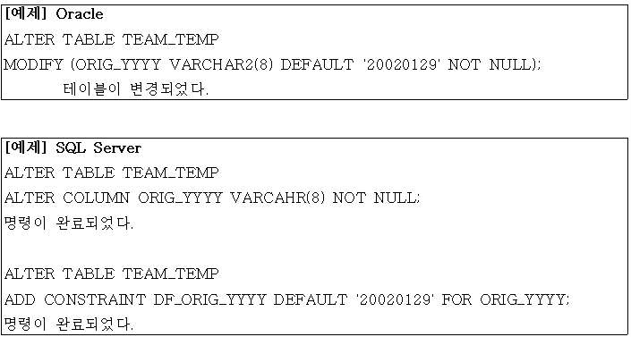 - ALTER TABLE 명령을 이용해 칼럼의 데이터 유형, 디폴트 값, NOT NULL 제약조건에 대해 변경을 포함 가능
