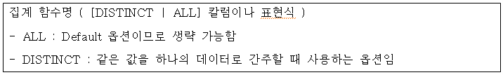 - 집계 함수의 통계정보는 NULL값을 가진 행을 제외하고 수행