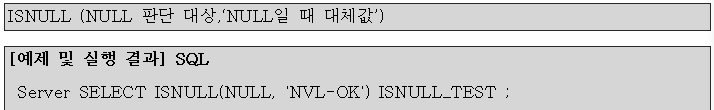 - 결과값을 NULL이 아닌 다른 값을 얻고자 할 때 NVL/ISNULL 함수를 사용
