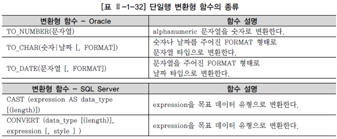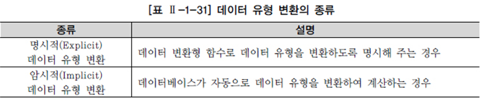 암시적 데이터 유형 변환 - 성능 저하가 발생할 수 있으며 자동적으로 db가 알아서 계산하지 않는 경우가 있어 에러를 발생할 수 있기에 명시적 데이터 유형 변환 방법을 사용하는 것이 바람직