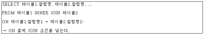 - 대부분 PK ↔ FK의 관계를 기반하며 WHERE절에 "=" 연산자를 사용해서 표현